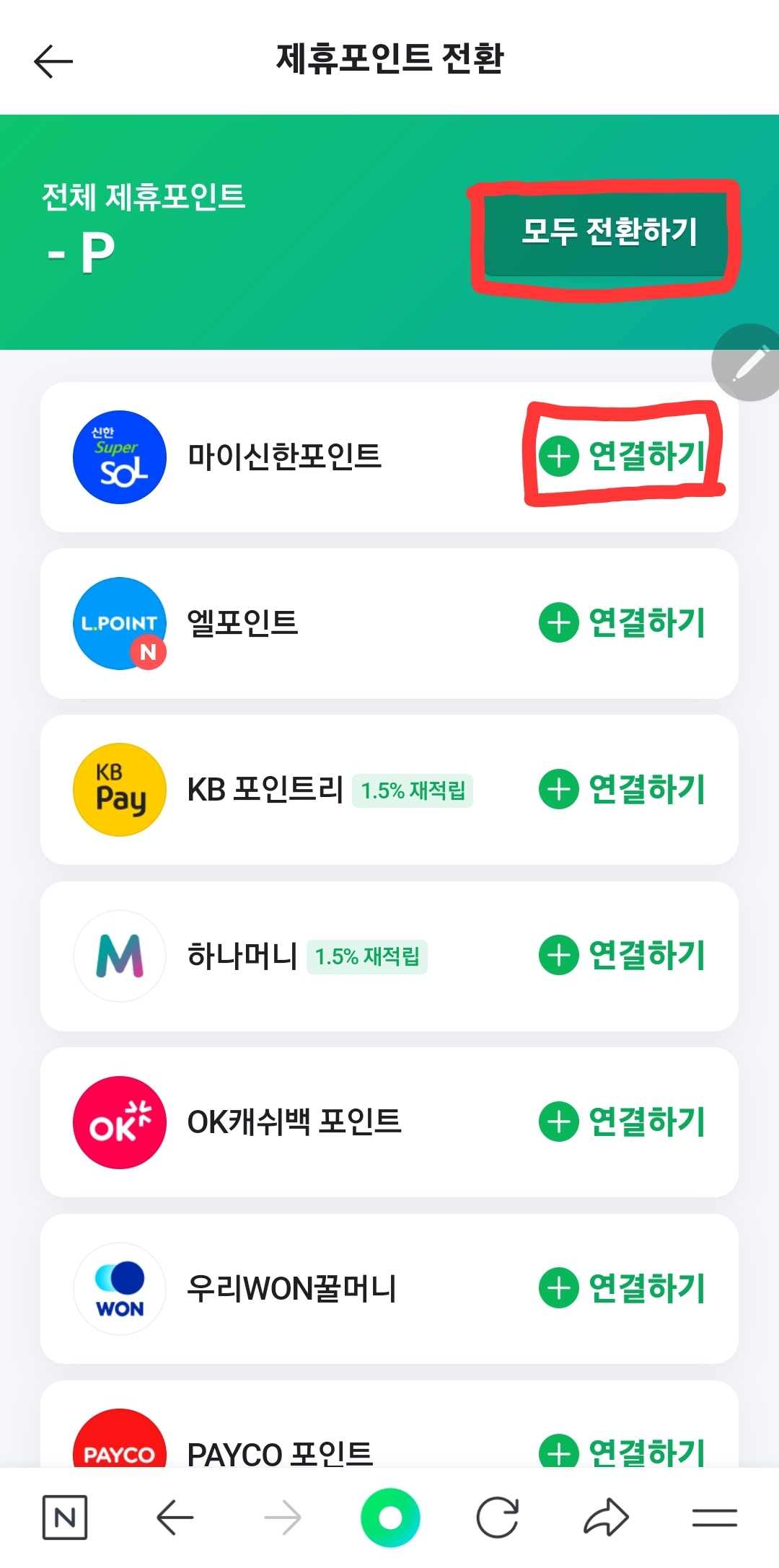 4. 연결하기 누르면 각 카드사 포인트가 조회됩니다. 모두 전환하기 또는 하나씩 전환해서 사용하면 됩니다.