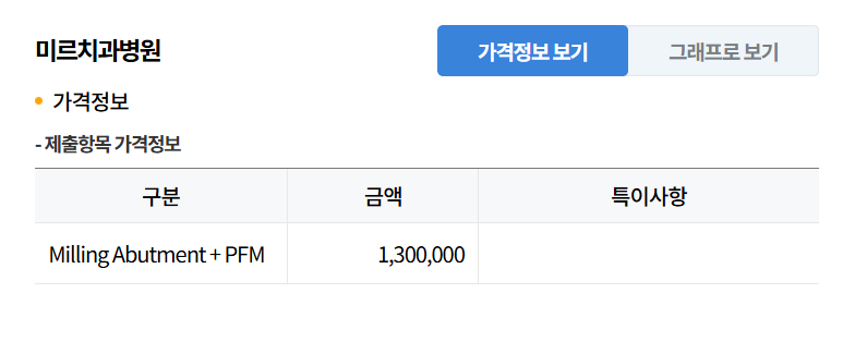 이런 식으로 찾으면 모두 2번치과는 69만원, 3번치과는 130만원을 알 수 있습니다. 그렇다면 이 세 곳의 가격을 알았고 비교해 볼 수 있습니다. 가장 저렴한곳은 모두2번, 높은곳은 3번입니다. 그 상태에서 이제 다음으로 넘어갑니다.