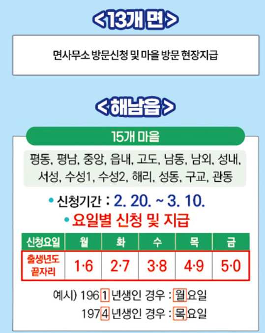 - 지급 대상: 2025년 1월 23일 오후 6시 기준 해남군에 주소를 둔 모든 군민