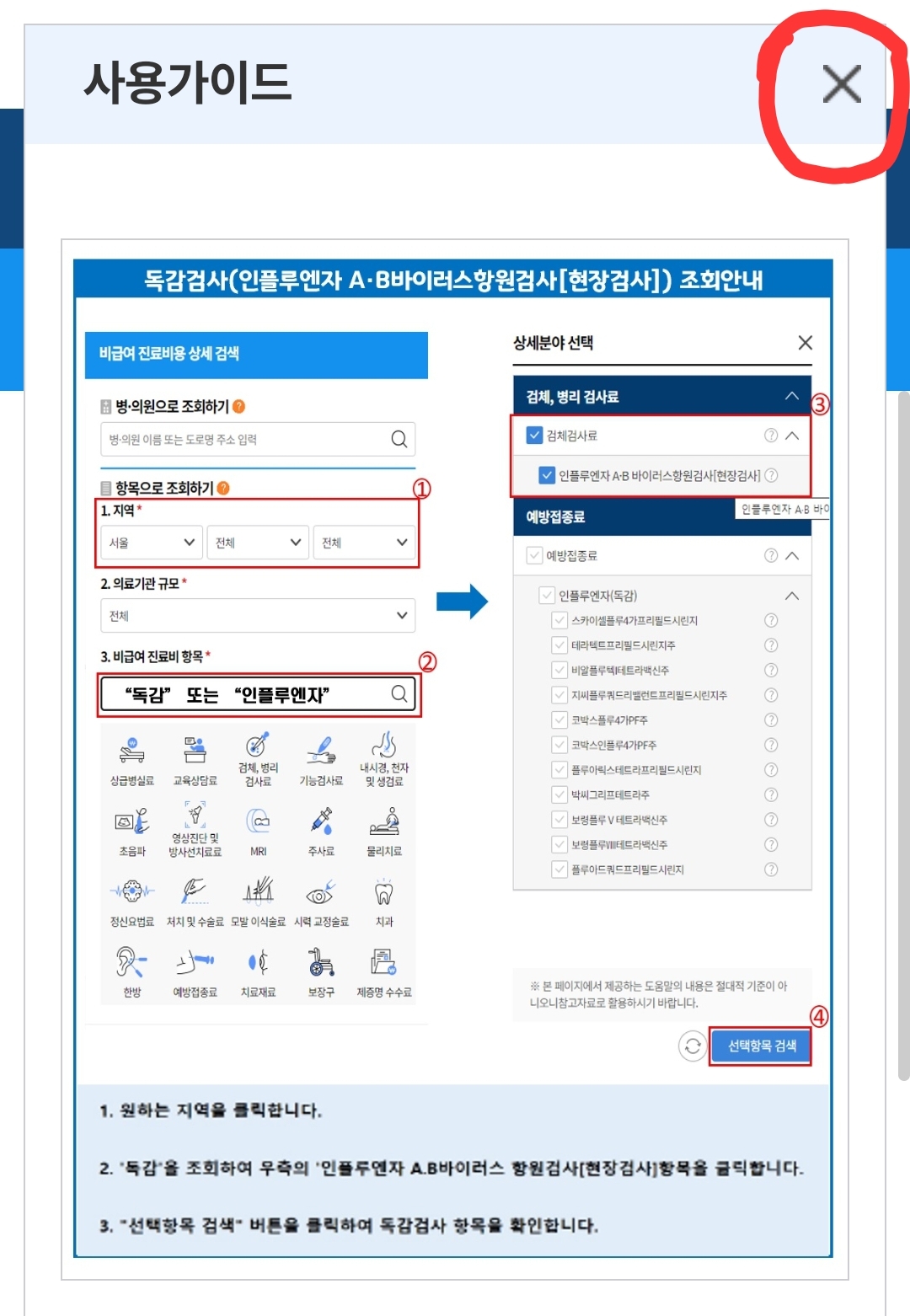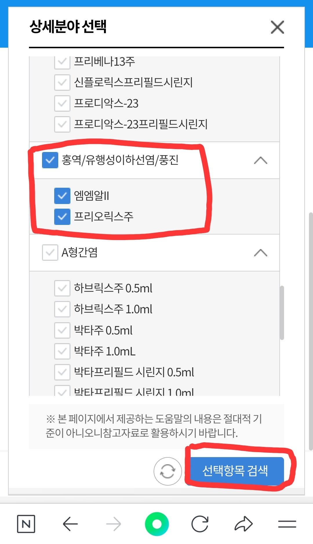 홍역 체크하고 '선택항목 검색' 누릅니다.