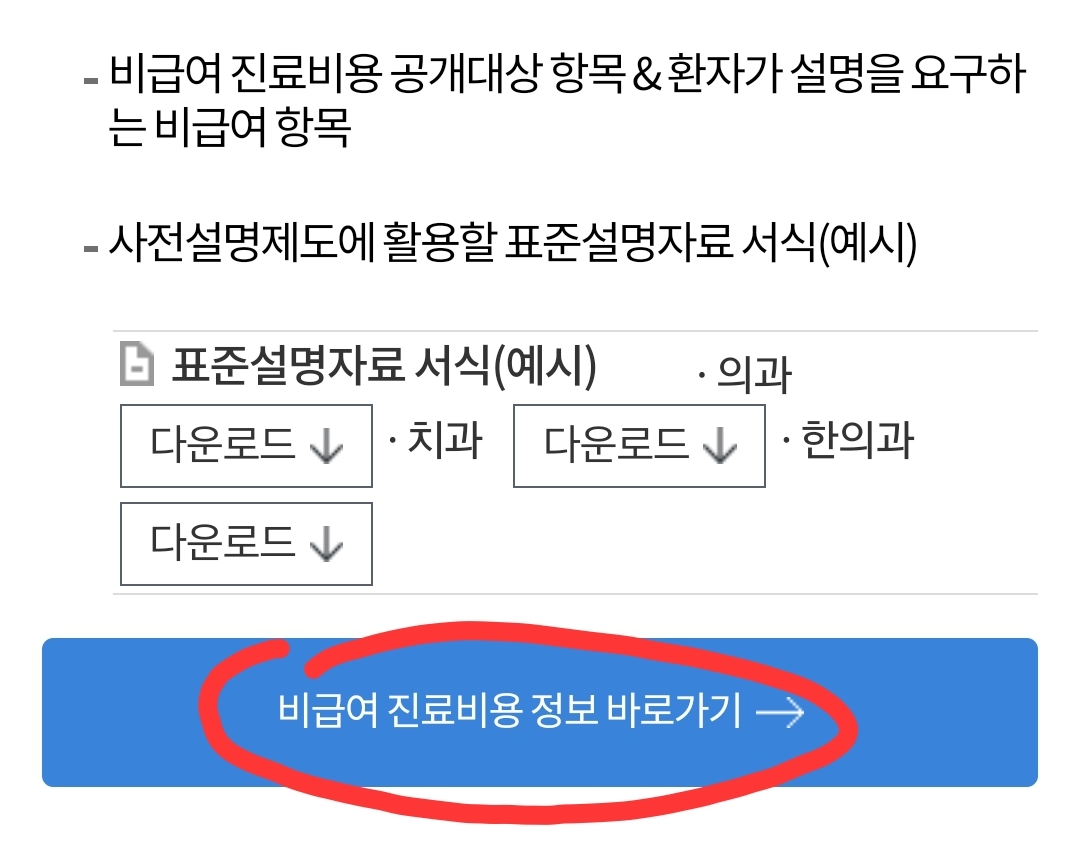 아래 내려서 '비급여 진료비용 정보 바로가기' 누릅니다.