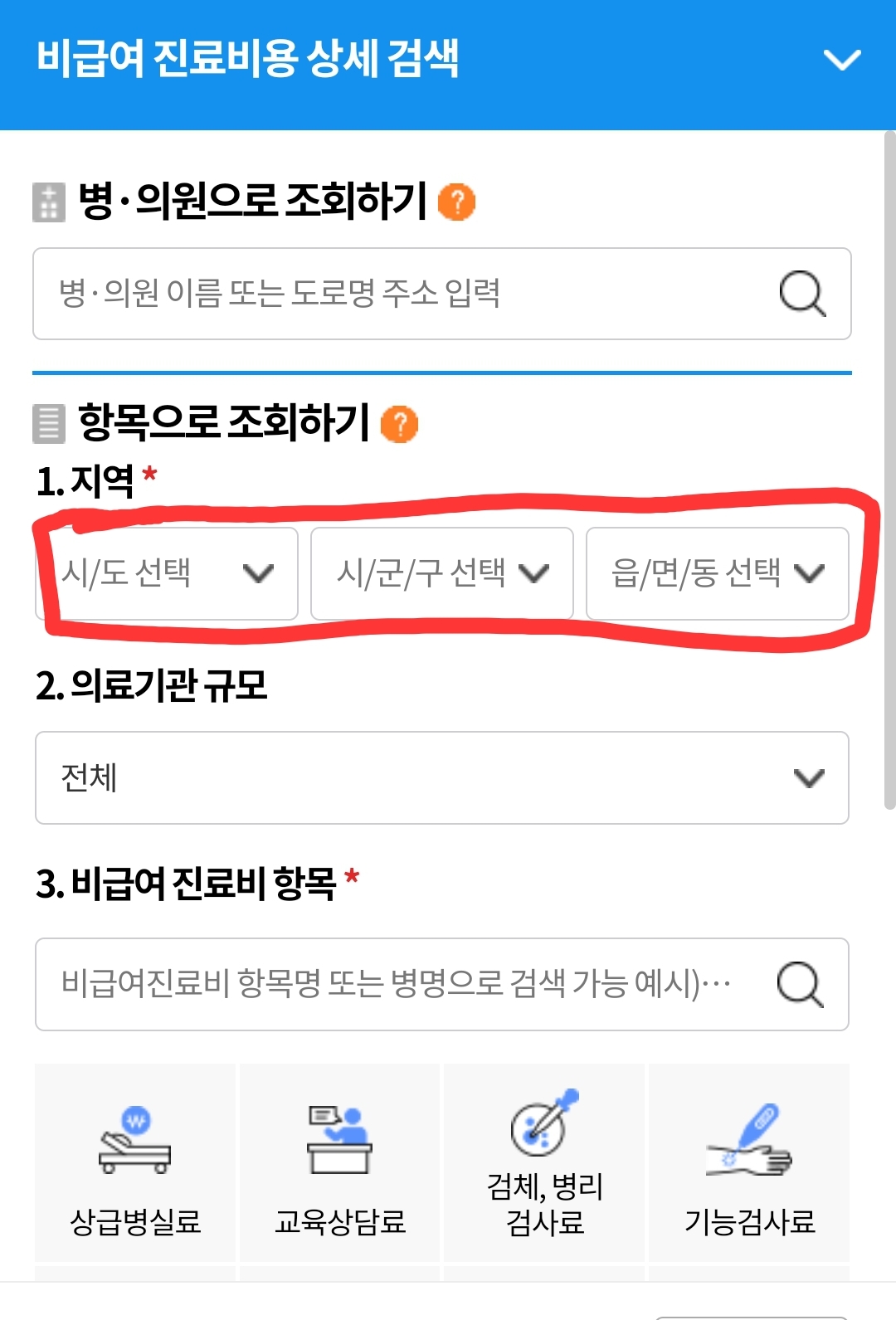 본인이 사는 지역을 선택합니다.