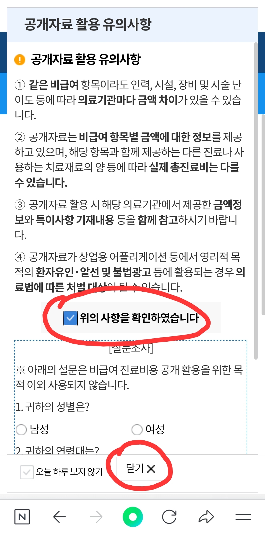 표가 뜨는데 '위의 사항을 확인하였습니다' 체크하고 닫기 합니다.