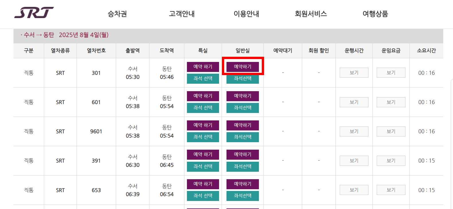 2. 시간표가 주르륵 나옵니다. 할인되는지 확인하기 위해 '운임요금' 보기 누를게요.